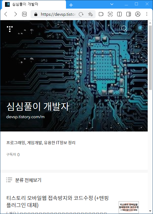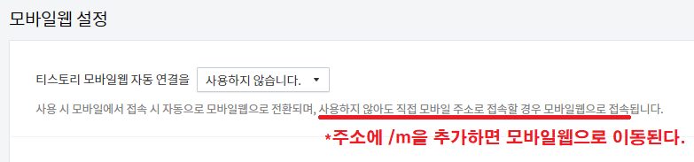 티스토리 블로그의 주소에서 /m을 더하면 카카오에서 제작한 모바일 스킨으로 강제적으로 넘어갑니다. 모바일 스킨의 경우 다음과 같은 단점이 있습니다. 자바스크립트, CSS 수정이 불가능해
