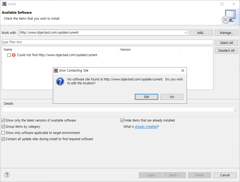 개발 환경이 바뀌면 이클립스에 다시 플러그인을 추가할때가 많은데 가령 이클립스 마켓플레이스(Marketplace)에 안나오거나 사용하지 못할 때! Help > Install New Software... 로 설치도 에러가 날때!